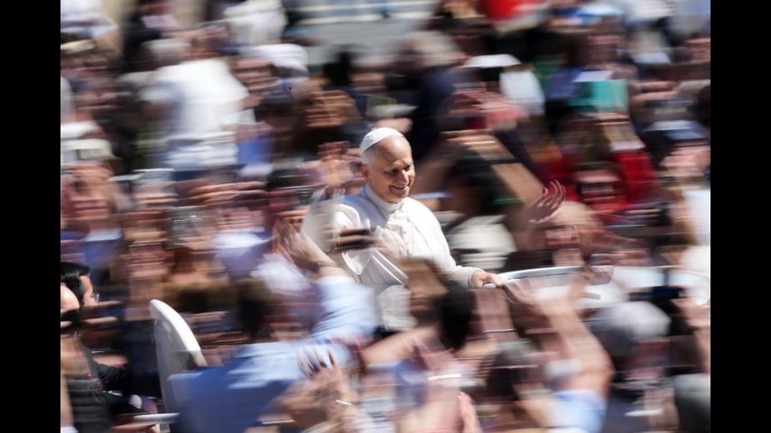 Before retreating into the basilica, Leo stepped forward out of the loggia's shadow and waved to the cheering crowd below. He later greeted people in the piazza from the popemobile that took him all the way down Via della Conciliazione toward the Tiber River and back.