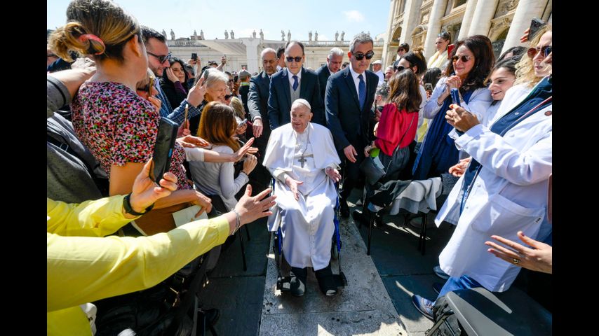 He wore nasal tubes to receive supplemental oxygen, which the Vatican says is being gradually reduced. As he waved and blessed the crowd, his arm movements remained limited — which his doctor said was not related to his illness but to an unspecified trauma suffered before his Feb. 14 hospitalization.