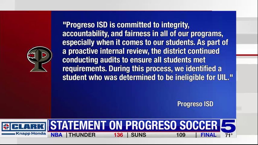 "Progreso ISD is committed to integrity, accountability, and fairness in all of our programs, especially when it comes to our students," the school district said via statement. "The district continued conducting audits to ensure all students met requirements. During this process, we identified a student who was determined to be ineligible for UIL."