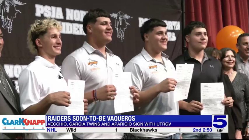 PSJA North Raiders Joe Derek Vecchio, Dante and Danny Garcia, and Ale Aparicio officially sign their letters of intent to play football at UTRGV. They officially etch their names into the history books as part of the first-ever signing class in UTRGV football program history.