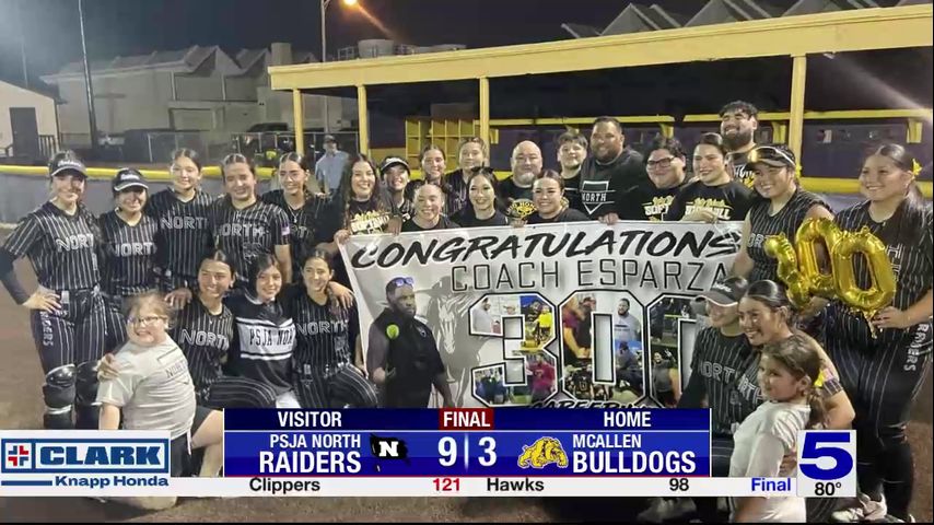 McAllen, TX -- PSJA North softball Head Coach Albert Esparza picks up his 300th career win with 9-3 victory over the McAllen Bulldogs.