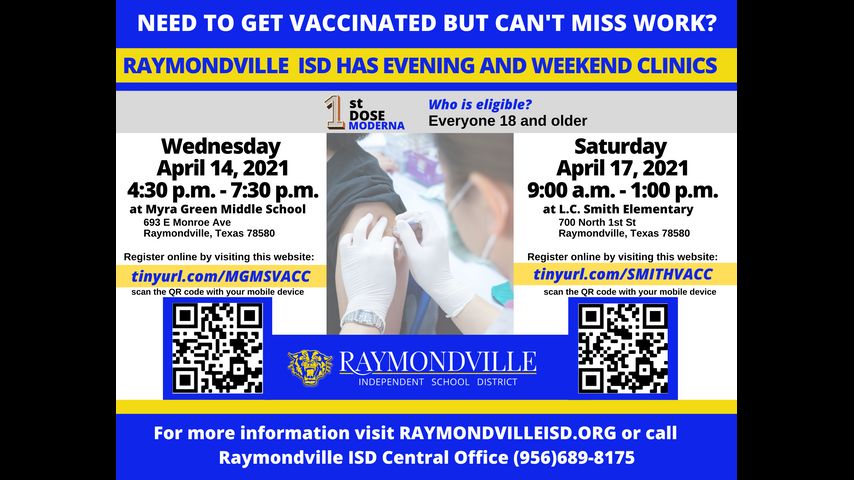 Raymondville ISD will hold an evening clinic and a weekend clinic this week for people 18 and older.