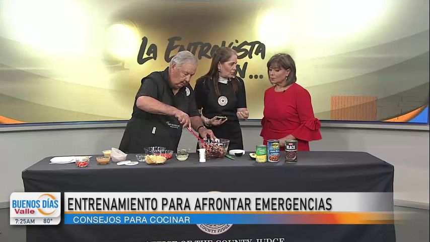 Richard Cortez, juez del condado Hidalgo, y Carolina Terán, manager de la oficina del juez del condado Hidalgo, visitan Noticias RGV para elaborar una receta llamada ensalada tejana soleada, la cual se puede elaborar de manera rápida en casos de emergencias como el paso de un huracán en el Valle.