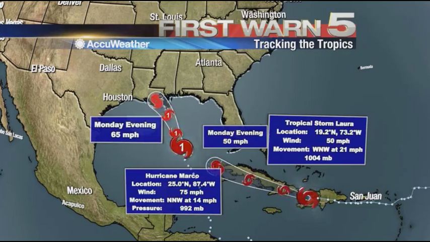 By Sunday afternoon, Laura was 55 miles (90 km) south of the eastern tip of Cuba with 50 mph (85 kmh) moving west-northwest at 21 mph (33 kmh). Marco was 280 miles (450 km) south-southeast of the mouth of the Mississippi River with 75 mph (120 kph) winds, moving north-northwest at 14 mph (22 kmh).