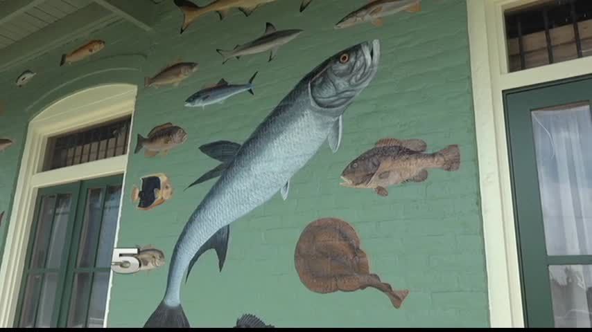En la noche, bajo las luces, se convierte en todo un panorama. El mural representa a los peces encontrados en la Laguna Madre y el Golfo de México.