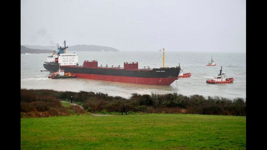 A spokeswoman for Britain's Maritime and Coastguard Agency said the 180-meter (590 foot) vessel "dragged her anchor and grounded" on the western part of the port entrance between Swanpool and Gyllyngvase beaches at around 5:40 a.m. (GMT) Tuesday.
