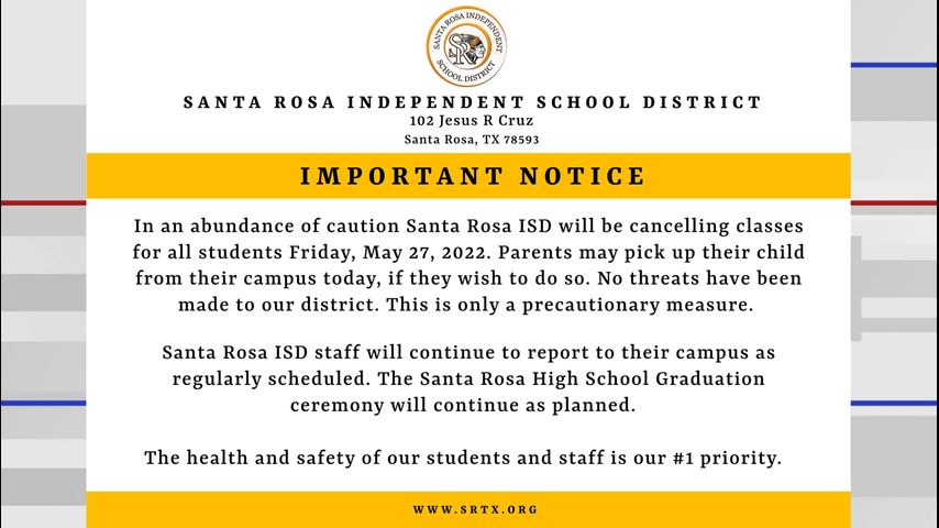 Santa Rosa ISD will cancel classes for all students on Friday, May 27.