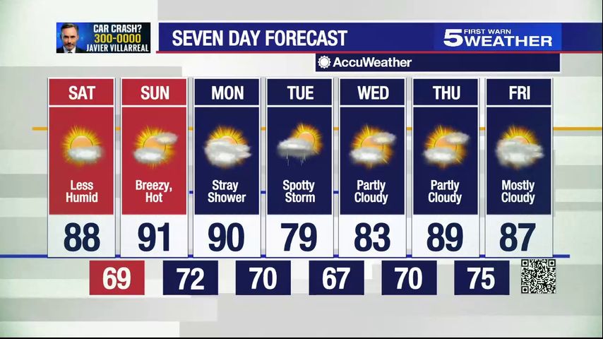 Saturday, March 25, 2023: Less humid, temperatures in the high 80s