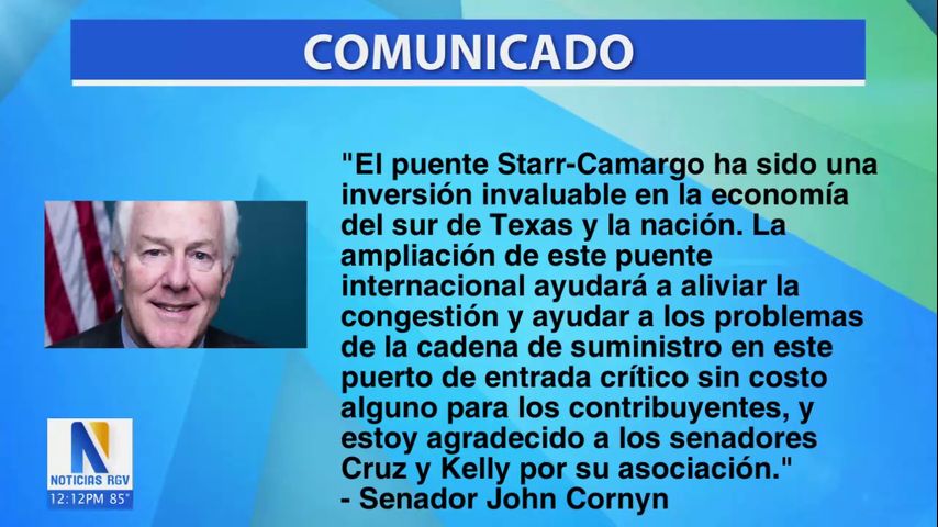 El senador Cornyn dijo que el puente Starr-Camargo ha sido una inversión valiosa en la economía del sur de Texas y la nación. Y ayudará a aliviar la congestión y solucionar los problemas de la cadena de suministro en este puerto de entrada.
