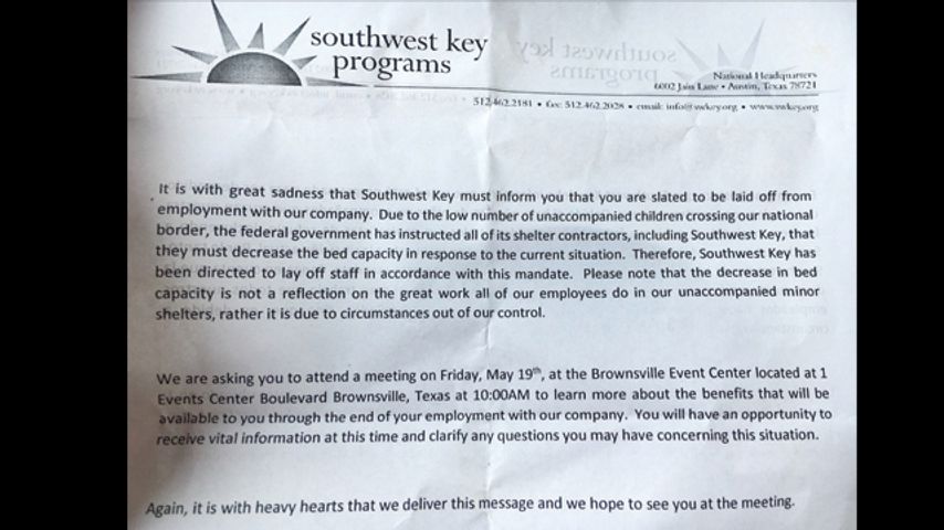 CHANNEL 5 NEWS obtained a copy of a letter given to those slated to be laid off. It states, "Due to the low number of unaccompanied children crossing our national border, the federal government has instructed all of its shelter contractors, including Southwest Key, that they must decrease the bed capacity in response to the current situation. Therefore, Southwest Key has been directed to lay off staff in accordance with this mandate."