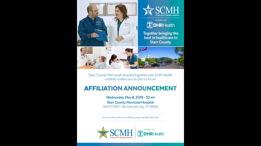 RIO GRANDE CITY - Starr County Memorial Hospital and DHR Health will be announcing the affiliation of the institutions Wednesday, May 8 at 10 a.m. at the Starr County Memorial Hospital, 128 FM 3167 Rio Grande City.