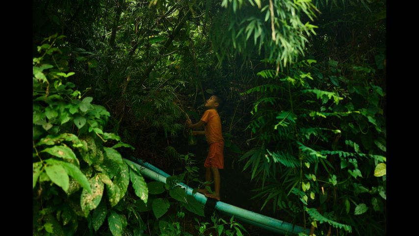 Eleven-year-old Soe fights the river's current on his own hunt for fish, his skinny frame swallowed by his pink T-shirt. Nearby, children haul logs as big as their bodies back to their shelters for their families to sell.