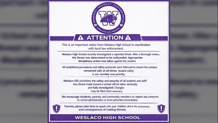According to the district, a thorough review of the threat was conducted between WeslacoHigh School and local law enforcement.