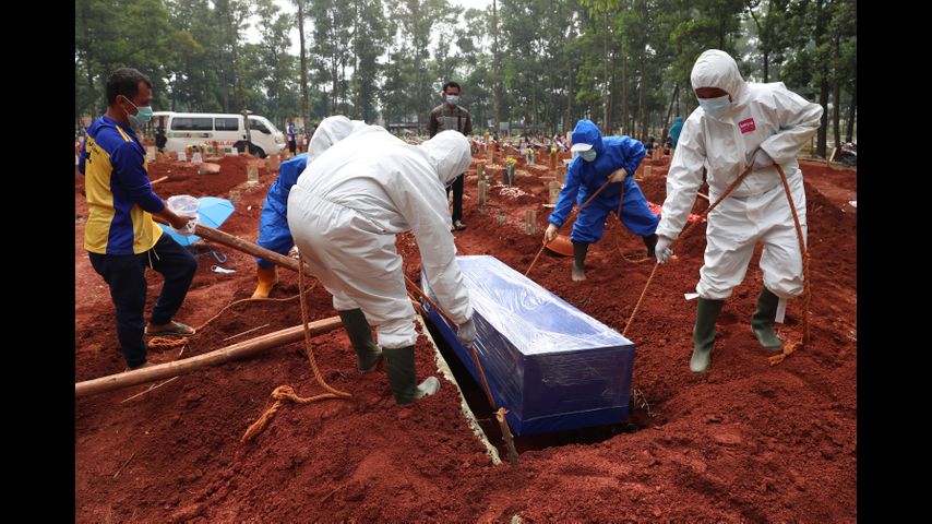 In Myanmar, crematoriums are working morning to night. In Indonesia, which recorded almost 1,000 deaths and over 54,000 new cases Wednesday, up from around 8,000 cases per day a month ago, people near Jakarta are pitching in to help gravediggers keep up.