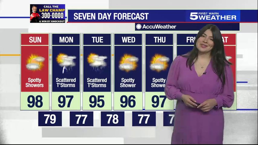 Sunday, Aug. 25, 2024: Spotty showers with a high of 98