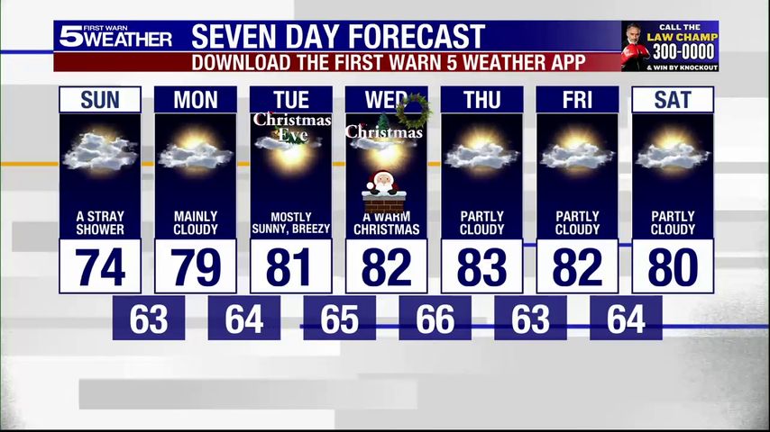 Sunday, Dec. 22, 2024: Stray shower with temperatures in the 70s