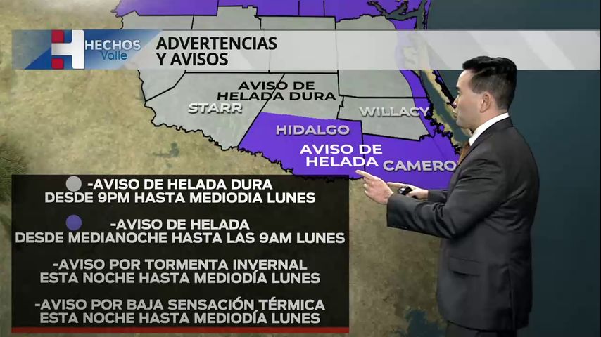 A partir de las 4:30 p.m. El domingo, el Servicio Meteorológico Nacional en Brownsville pronosticó, además del desarrollo significativo de hielo y aguanieve, que las temperaturas bajarán entre 21 y 28 grados a las 7 am del lunes, posiblemente hasta 18 grados antes de alcanzar los 30 grados bajo a tarde.