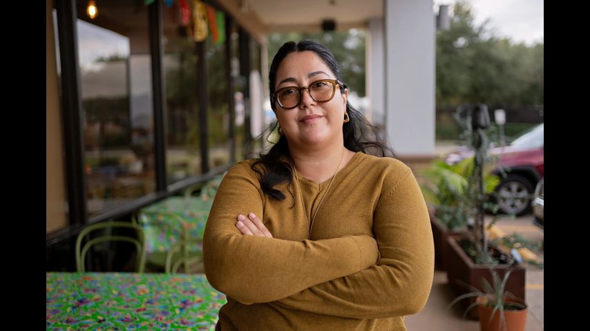 First: Victoria Elizondo, a DACA recipient and chef-owner of Cochinita & Co., in her Houston restaurant on Nov. 8, 2024. Last: Elizondo has a laugh with her employees in the kitchen. Credit: Danielle Villasana for The Texas Tribune