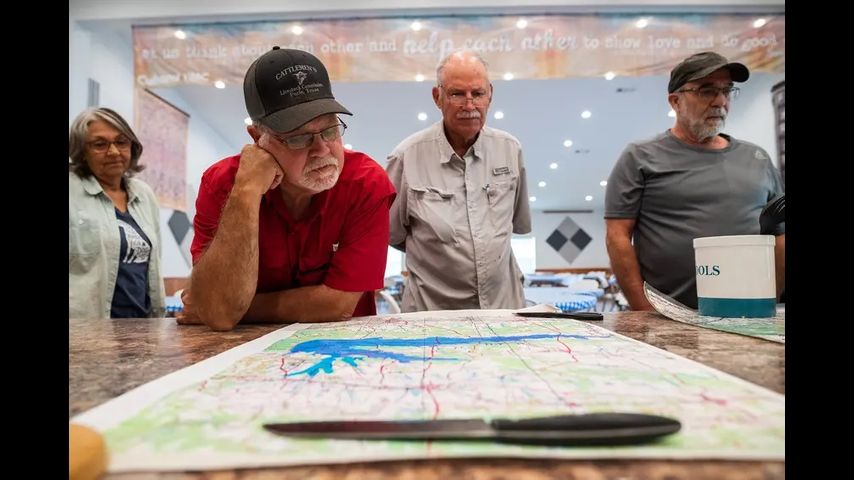 First: Gary Cheatwood, a longtime resident of Red River County, discusses with other residents the possible construction of the Marvin Nichols Reservoir, which could flood their homes and land. Last: Red circles on a map mark homes that could be flooded if the reservoir is built. Credit: Ben Torres for The Texas Tribune