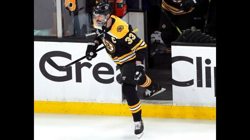 Boston Bruins captain Zdeno Chara is on the ice for pregame warmups. Matt Grzelcyk is not and will miss Game 5 of the Stanley Cup Final against the St. Louis Blues.