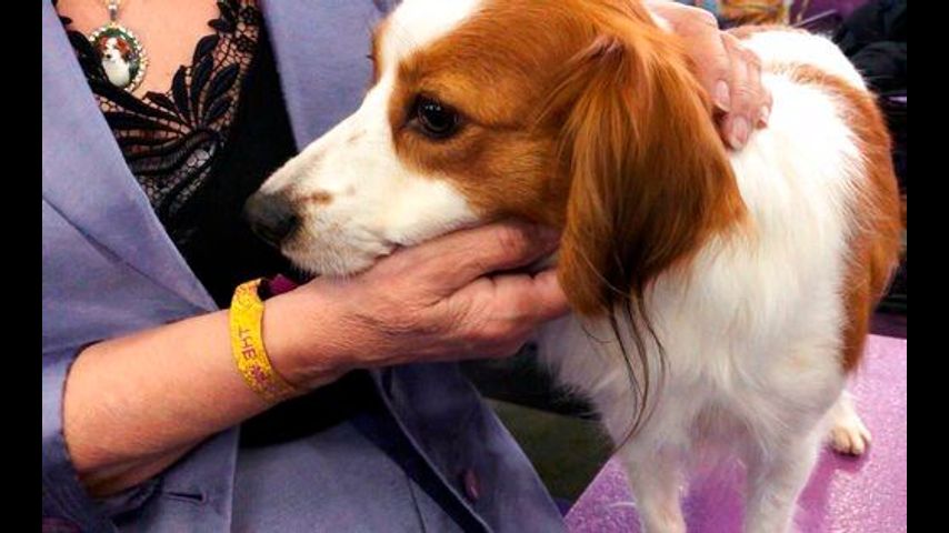 Primadonna, the first ever Nederlandse kooikerhandje champion at an event in January of 2018, stuck close to handler Deborah Bean when dragged from her lair. Primadonna got a ribbon Tuesday, and now the 5 1/2-year-old is ready for retirement - something Bean revealed while wiping away a tear.