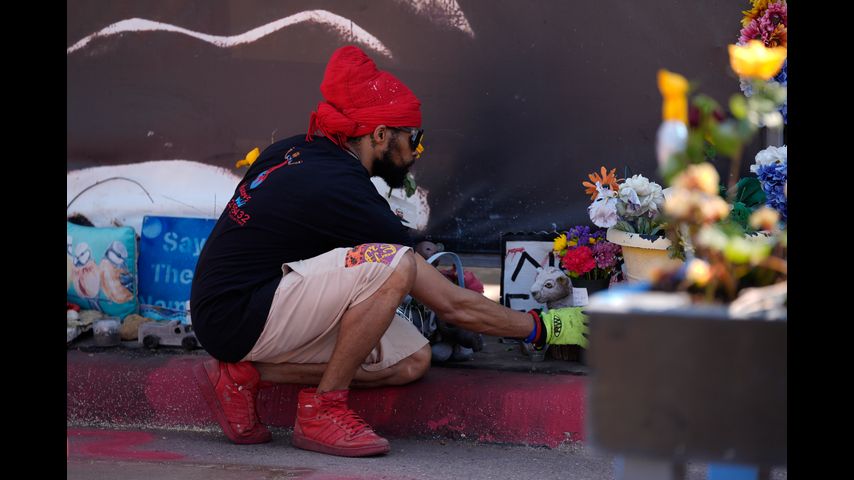 Detrius Smith of Dallas, who was visiting the Floyd memorial site with her three daughters and five grandchildren, told one granddaughter about how people globally united to decry racial injustice after Floyd's murder.