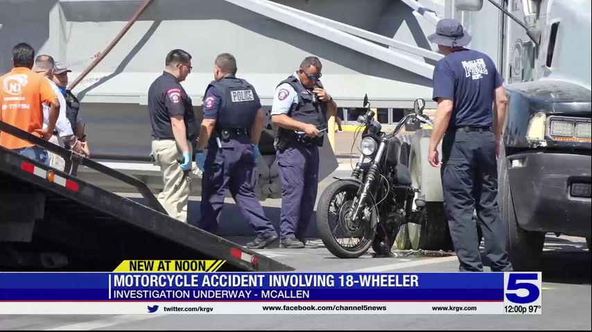 Officers with the McAllen Police Department responded to a motor vehicle collision involving a tractor-trailer and a motorcycle at the 1000 block of Tamarack Avenue at around 10 a.m. Friday, according to McAllen polices spokeswoman Olivia Lopez.