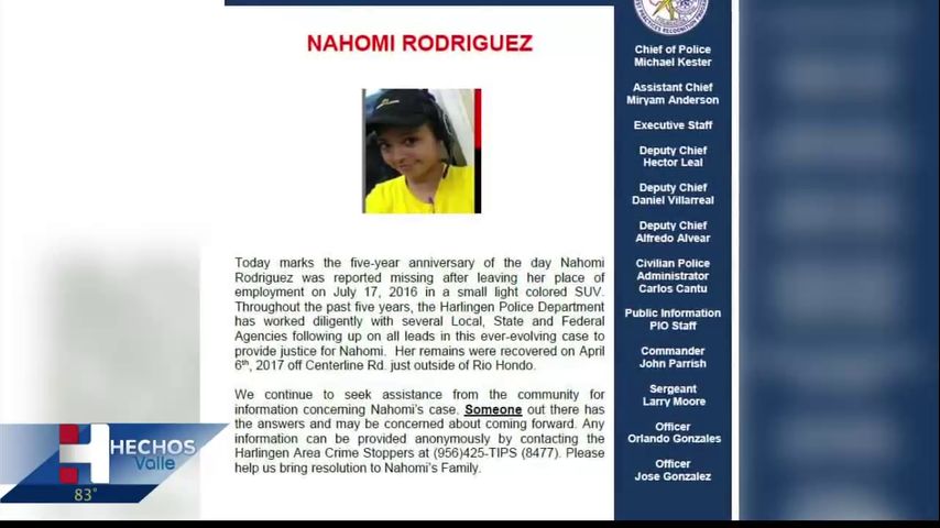 Ya han pasado 5 años de la desaparición y muerte de una adolescente residente de San Benito, Nahomi Rodríguez de 19 años sus familiares y amigos y las autoridades están pidiendo al público la ayuda para encontrar a el o los responsables de su muerte.