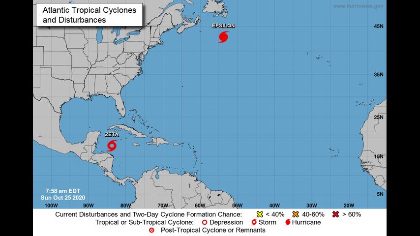 Zeta was stationary, located near the Yucatan Peninsula about 260 miles (415 kilometers) east-southeast of Cozumel, Mexico. A tropical storm warning was in effect for Pinar del Rio, Cuba, and a tropical storm watch was in effect for Cozumel and for Tulum to Río Lagartos, Mexico.