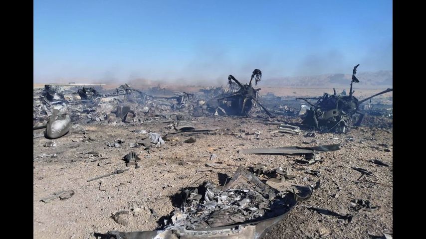 In this image provided by Sepahnews, the Iranian Revolutionary Guard's official website, wreckage is shown at what Iran's state TV claimed was the site of a downed American transport plane and two helicopters involved in a rescue operation, in Isfahan province, Iran, April, 2026. (Sepahnews via AP)