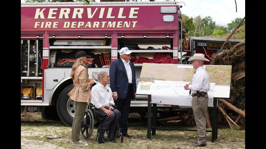 Air Force One landed in San Antonio with Trump deplaning in a suit and first lady Melania Trump wearing more casual clothing. Both wore ball caps against the heat. The first couple saw the aftermath from the air, then met privately with first responders and relatives of flood victims.