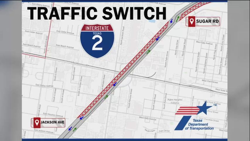 According to a TxDOT news release, the closures are being done to shift traffic from the existing I-2 eastbound and westbound main lanes to newly constructed main lanes between Sugar Road and Jackson Road.