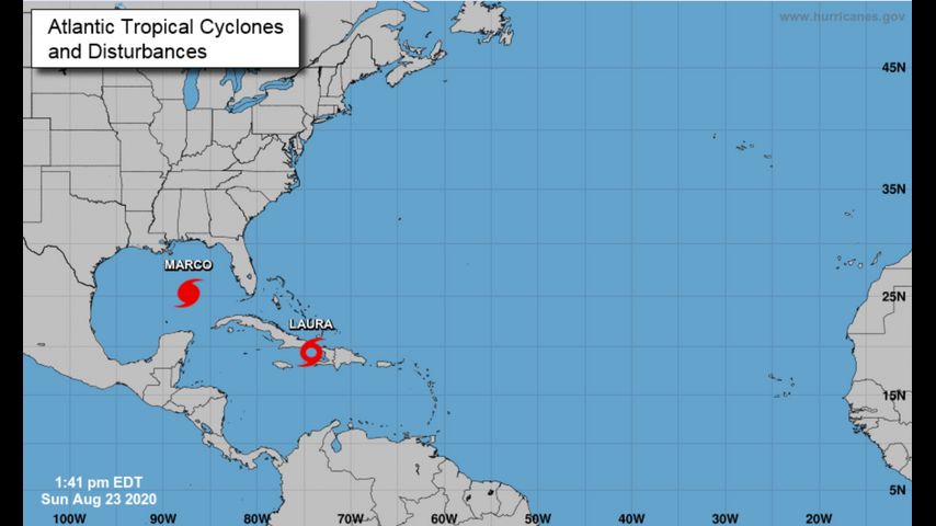 {1PM Sun} Marco is now a hurricane with winds of 75 mph.. Marco is still expected to make landfall in Louisiana. Laura: The track has shifted further west and is now forecast to become a cat. 2 hurricane sometime overnight Wed. Keep an eye out! #Tropics pic.twitter.com/0MMbXEhCSk
