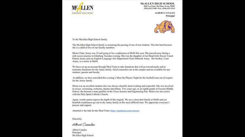 Una estudiante de segundo año de universidad en McAllen High School murió el martes durante la práctica de fútbol soccer del club en Edinburg, dijo el distrito en un comunicado de prensa del miércoles.