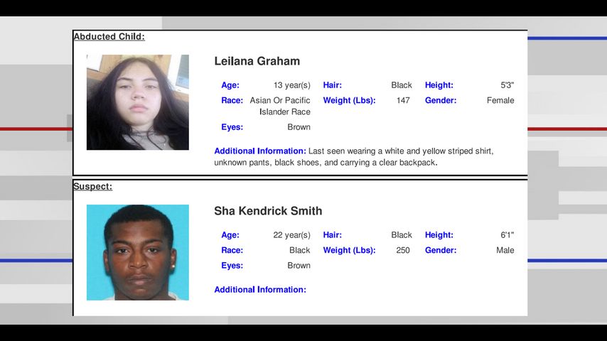 UPDATE at 8:27 a.m. Thursday: The Amber Alert for 13-year-old Leilana Graham has been discontinued. Officials say Graham has been found.