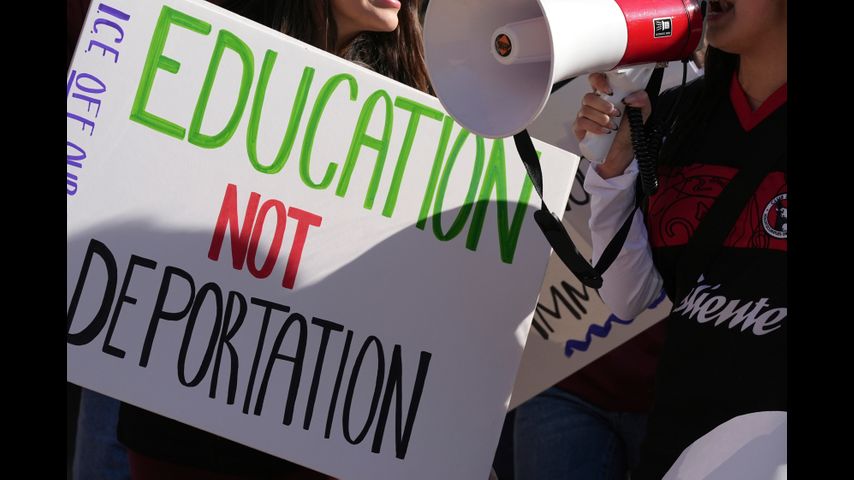 FILE - Students march at Arizona State University in protest of ASU's chapter of College Republicans United-led event encouraging students to report "their criminal classmates to ICE for deportations", Jan. 31, 2025, in Tempe, Ariz. (AP Photo/Ross D. Franklin, File)