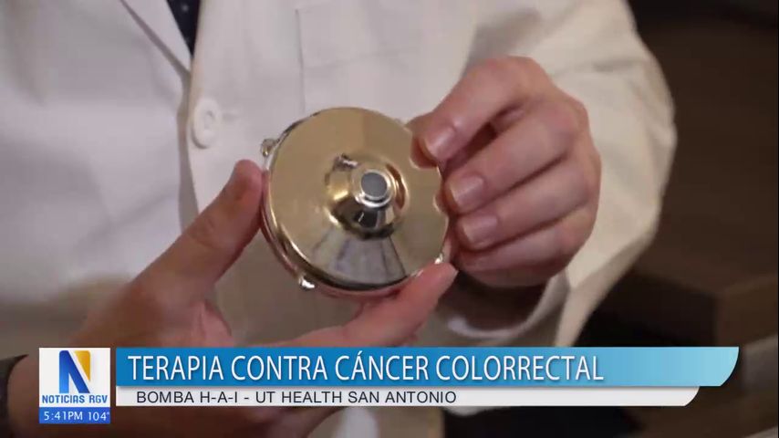 "Hay un catéter que sale de aquí y va directamente al hígado", agrega Colin Court, MD, PhD, Surgical Oncology, UT Health San Antonio.