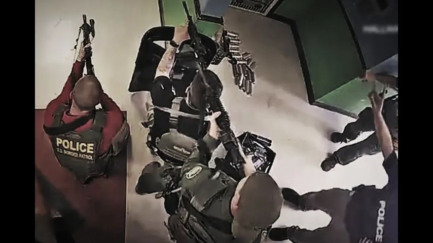 In one 30-minute video released Tuesday, officers lined up in the school hallway as they prepared to breach a classroom door about an hour after the shooter first entered the building. The footage, while not new, showed a slightly different angle from what had previously been released. In it, victims are completely blurred, but their cries and screams can be heard and blood is visible in the hallway. The video also shows officers performing chest compressions on a victim on the sidewalk.