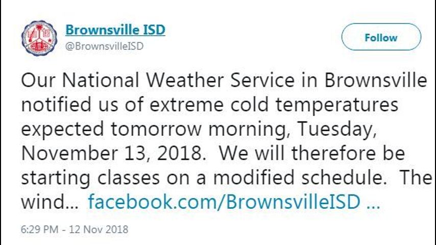 BROWNSVILLE - Brownsville Independent School District has delayed their start times on Tuesday, Nov. 13 due to expected cold temperatures.