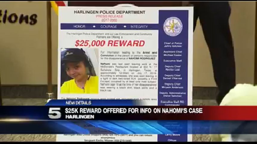 HARLINGEN – Agencias policiacas está ofreciendo una recompensa de $25,000 para información que lleve al arresto y convicción de la persona o personas responsables por la muerte de Nahomi Rodriguez.