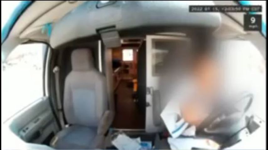 The video shows the woman pushing away a 69-year-old hospital security guard before driving off in the ambulance shortly after 12 p.m.