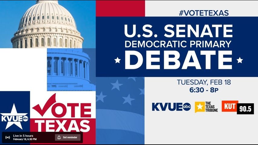KVUE and 11 other networks in Texas will stream the entire debate online beginning at 6:30 p.m. KVUE will broadcast a portion of the debate on TV from 6:30 p.m. to 7 p.m. KUT will also radio broadcast the debate. Texas Tribune political reporter Patrick Svitek, KVUE reporter Ashley Goudeau and KUT reporter Ashley Lopez will moderate the debate. Watch it above.