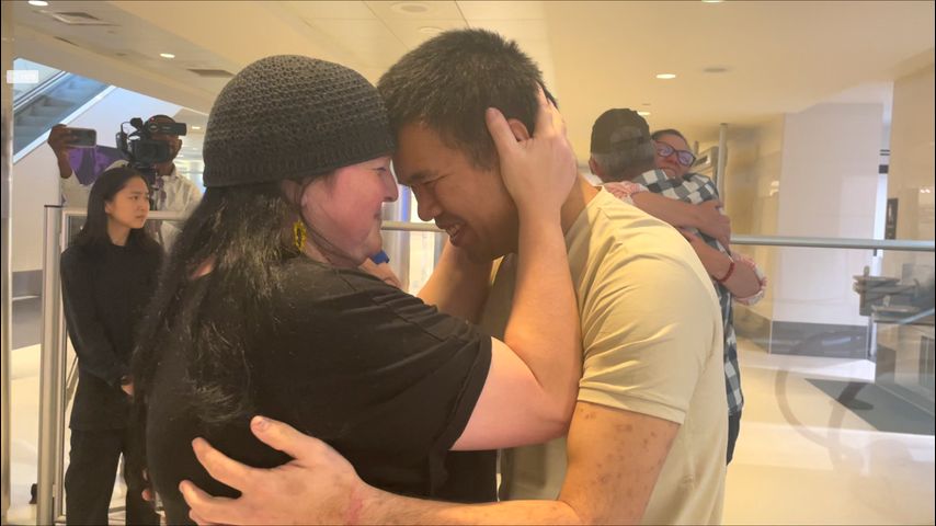 Smiling but looking tired, the two were pulled into long emotional hugs by family members after their connecting flight home. Then they were whisked to a waiting car.