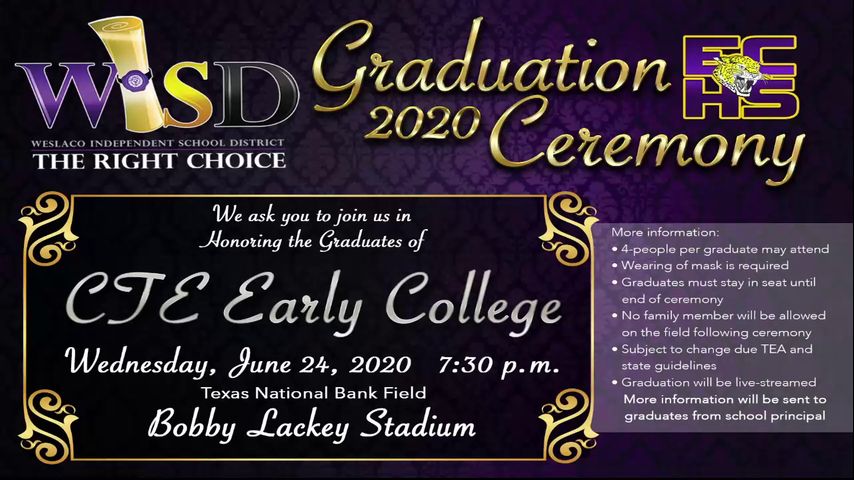 Graduations for all Weslaco ISD high schools will be held at the Bobby Lackey Stadium.