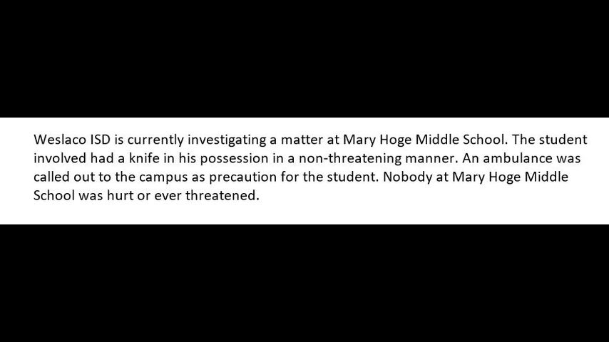 In a statement to Channel 5, Weslaco ISD said it happened at Mary Hoge Middle School and that the student did not threaten anyone with the knife.