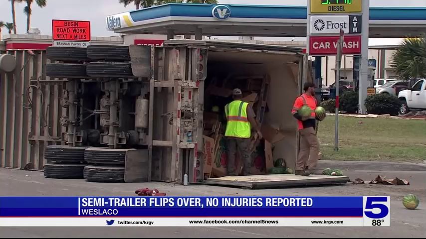 An 18-wheeler carrying watermelons flipped over Saturday afternoon, according to the Weslaco Police Department.