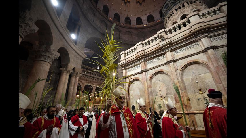 Christian pilgrims in the Holy Land mark Palm Sunday by holding Masses and processions retracing Jesus' triumphal entry. Worshippers carry palm fronds and olive branches and march from the top of the neighboring Mount of Olives to Jerusalem's historic Old City, home to holy sites of the three Abrahamic monotheistic faiths.