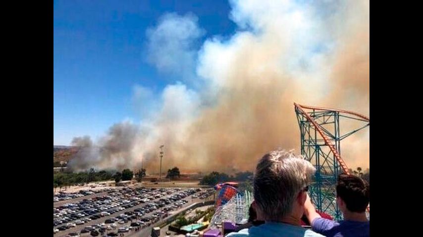 SANTA CLARITA, Calif. (AP) - A fast-moving brush fire erupted near a huge amusement and water park in Southern California on Sunday, sending hundreds of visitors to the exit to escape clouds of smoke and ash before fire officials asked them to stay put while they worked to contain the blaze.