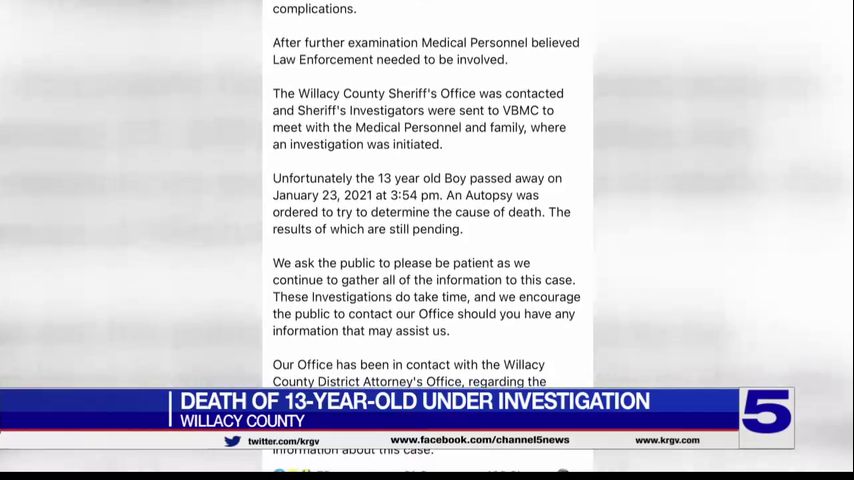 The Willacy County Sheriff's Office is investigating the death of a 13-year-old boy.