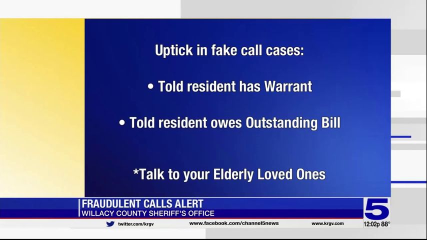 The sheriff’s office reported an “uptick” in persons reporting fraudulent calls from individuals claiming to be working for the Willacy County Sheriff's Office, informing them they must pay them to take care of warrants or outstanding bills.